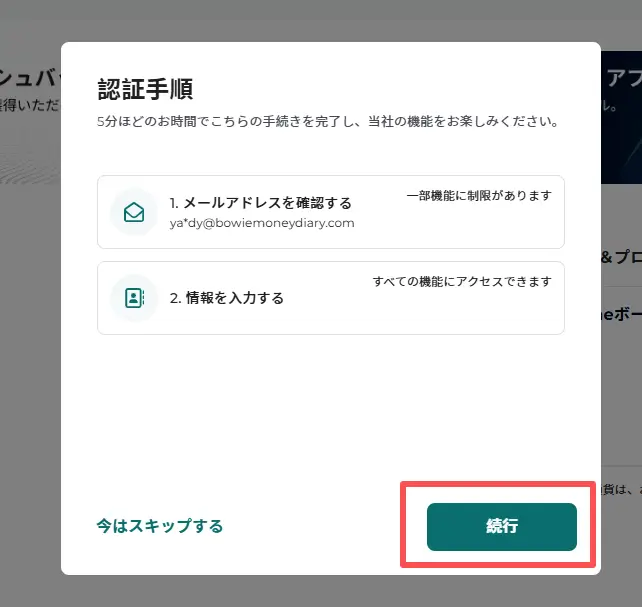 「続行」をクリックすると、登録時に入力したメールアドレス宛にメールアドレス認証の画面が表示されます。