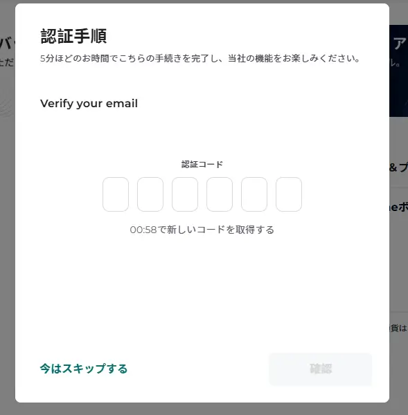 届いたメール内に認証コードがあります。