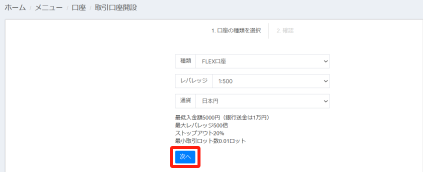 最後に、「⼝座」メニューから「取引⼝座開設」をクリックし、⼝座タイプの設定を⾏ってください。