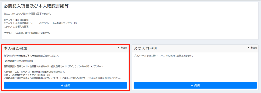 スムーズに⼿続きを進めるために、本⼈確認書類と住所確認書類のそれぞれ1点ずつをご準備の上、マイページからアップロードをお願いします。