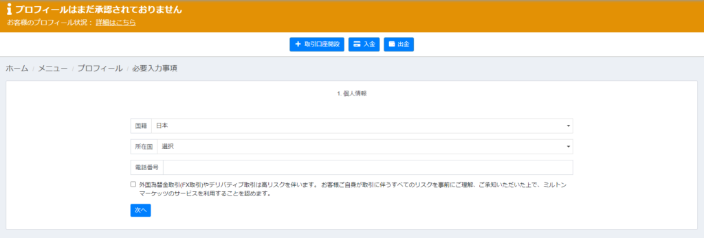 まず、以下のボタンからMilton Marketsの⼝座開設にアクセスして⼿続きを開始してください。