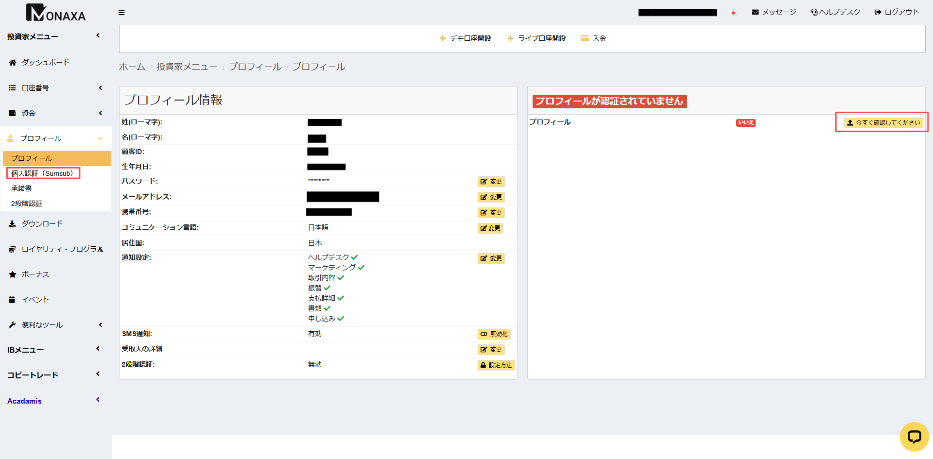 続いて、左側にある「個人認証(Sumsub)」、もしくは右側の「今すぐ認証してください」をクリックします。