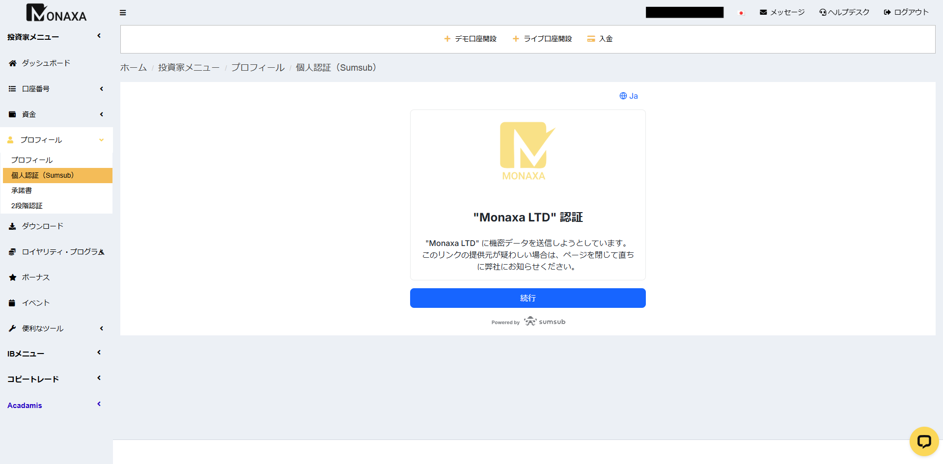 あとは自動的にMonaxaのパーソナルエリアページに移動します。