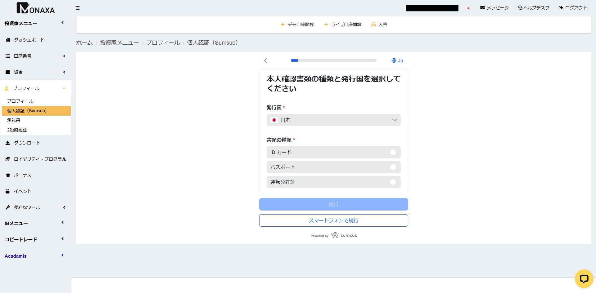 Monaxa(モナクサ)に提出予定の書類が発行された国と、書類の種類を選択し、「続行」ボタンをクリックします。