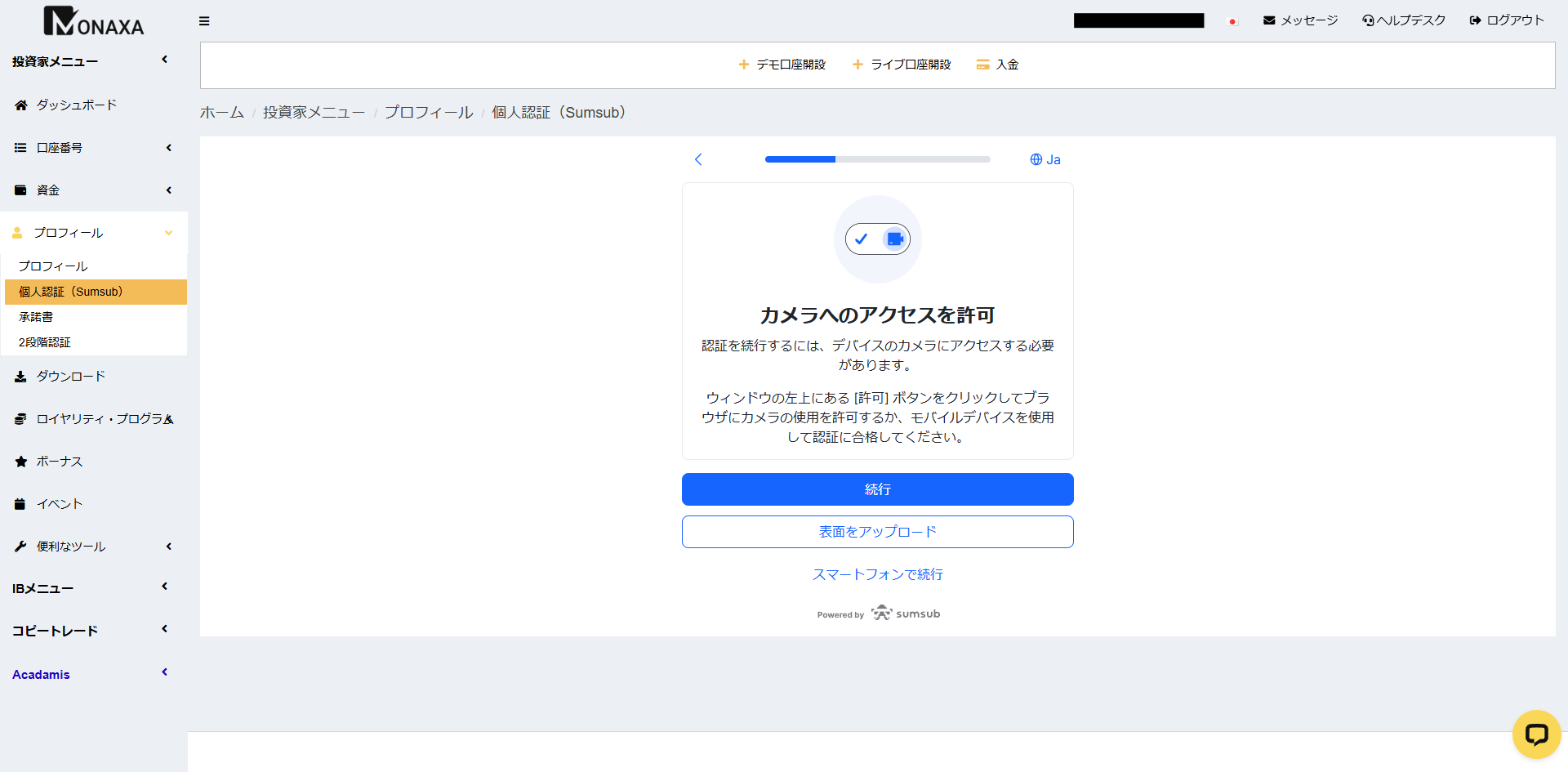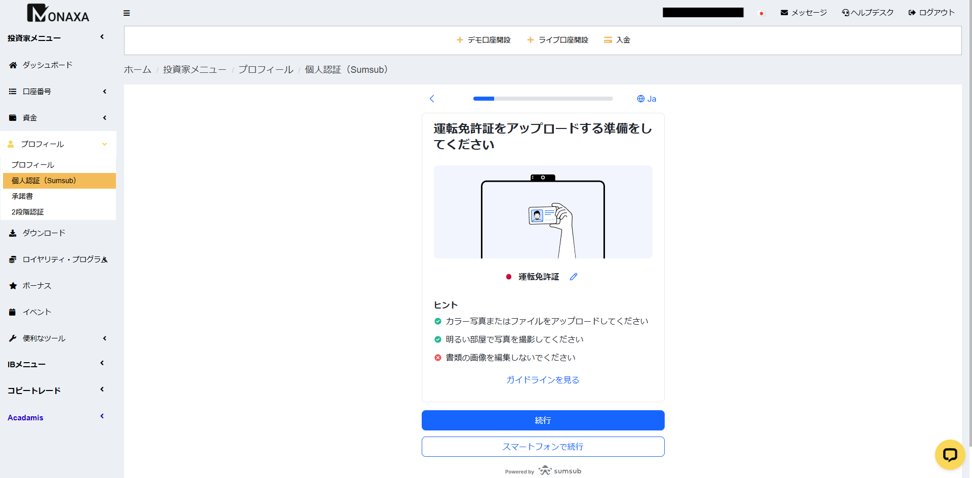 本人確認書類の画像を用意していない方は、「続行」ボタンをクリックして、使用しているデバイスで書類を撮影する必要があります。