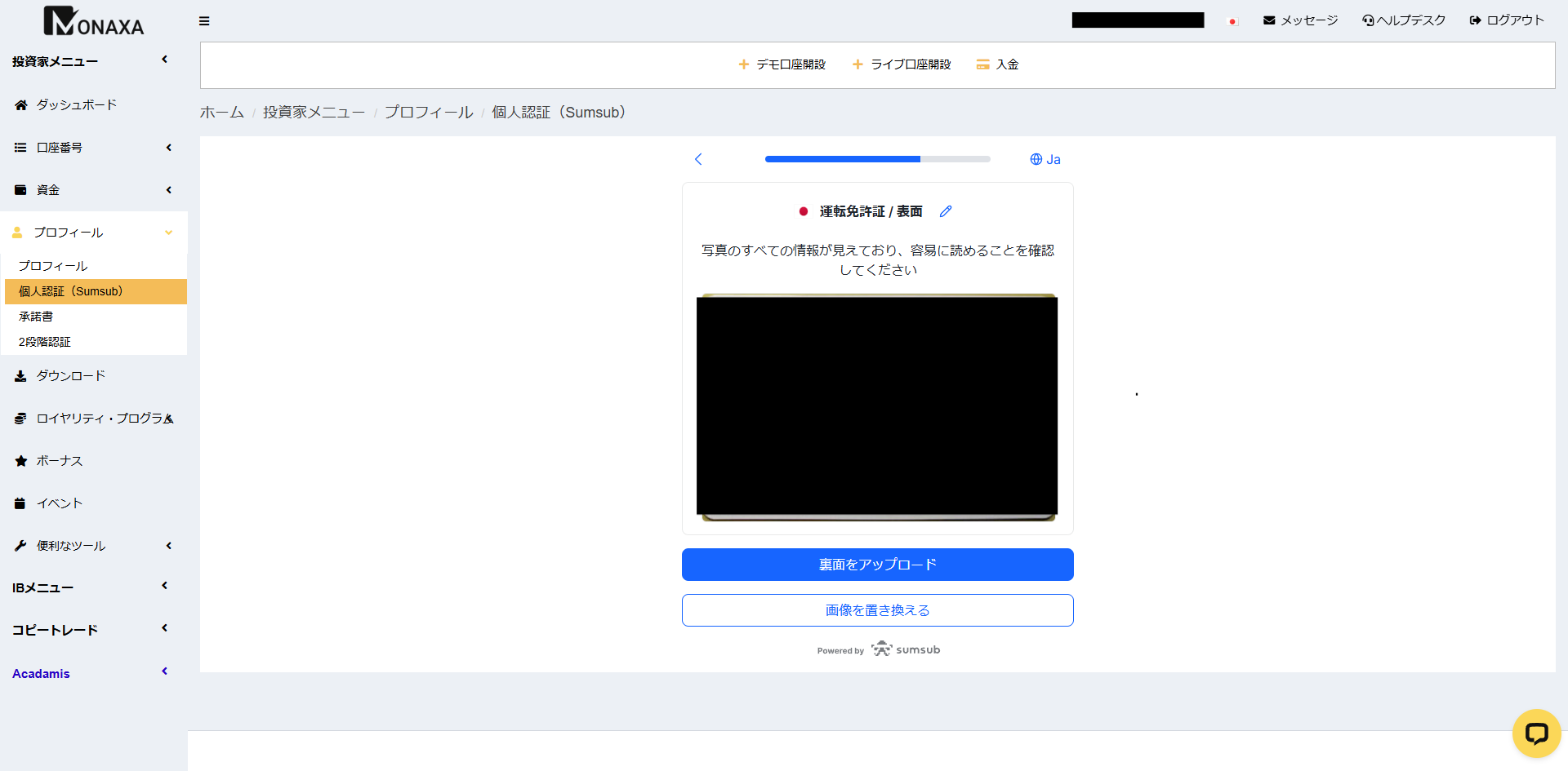 裏面をアップロードすれば、Monaxa(モナクサ)の本人確認の手順は完了です。