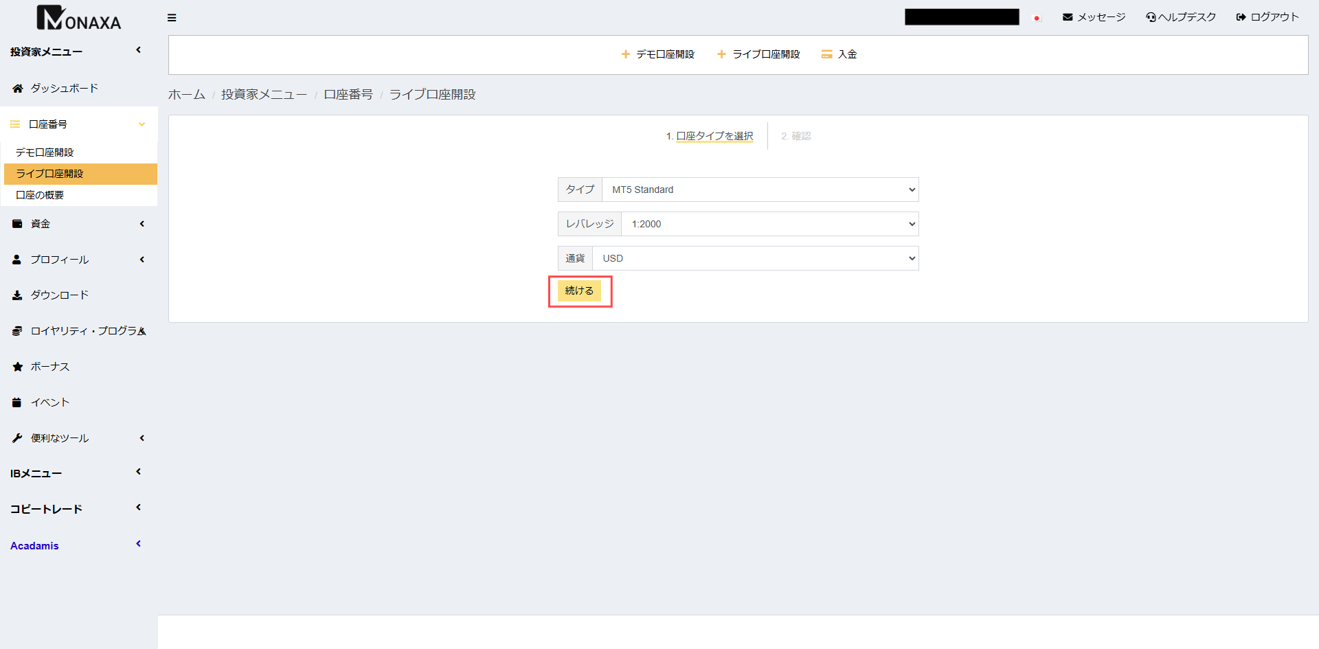 口座タイプ、レバレッジ、通貨を設定して「続ける」ボタンをクリックします。