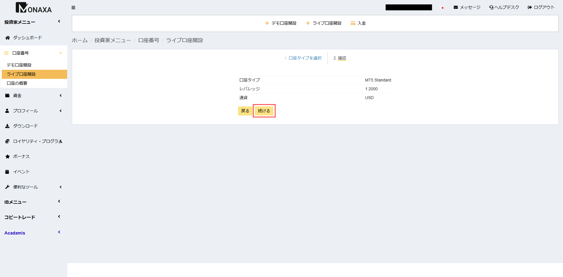 設定した口座タイプ、レバレッジ、通貨を確認したら、「続ける」ボタンをクリックします。