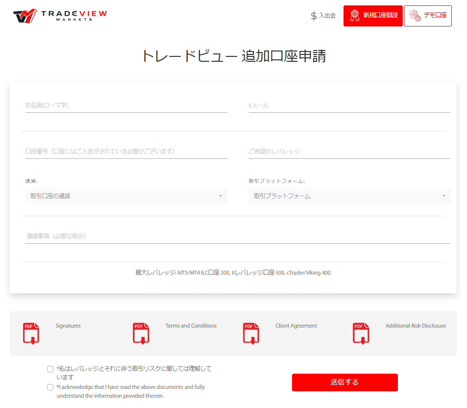 チェック項目の内容を確認し、ボックスにチェックを入れたら、「送信する」をクリックしてください。これで追加口座の申請は完了です。