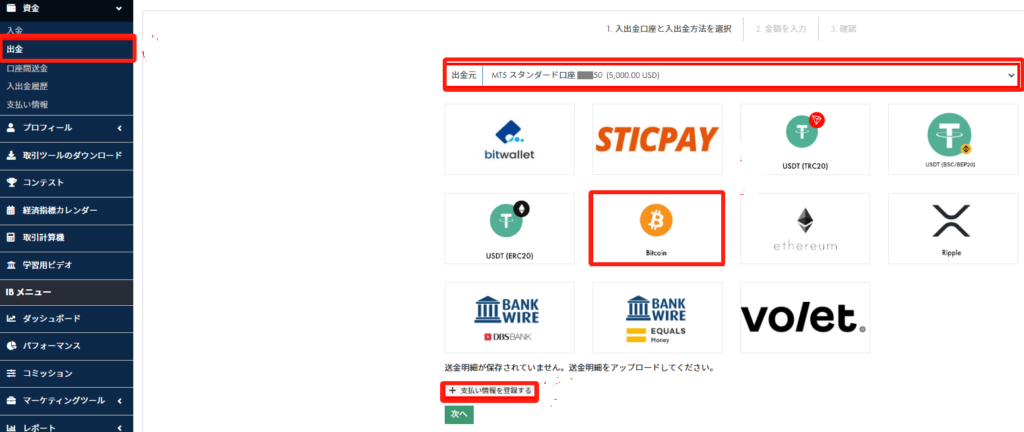 既にBitcoinのウォレット情報を登録済みの場合は、「⽀払い情報」を選択し、「次へ」のボタンを押してください。