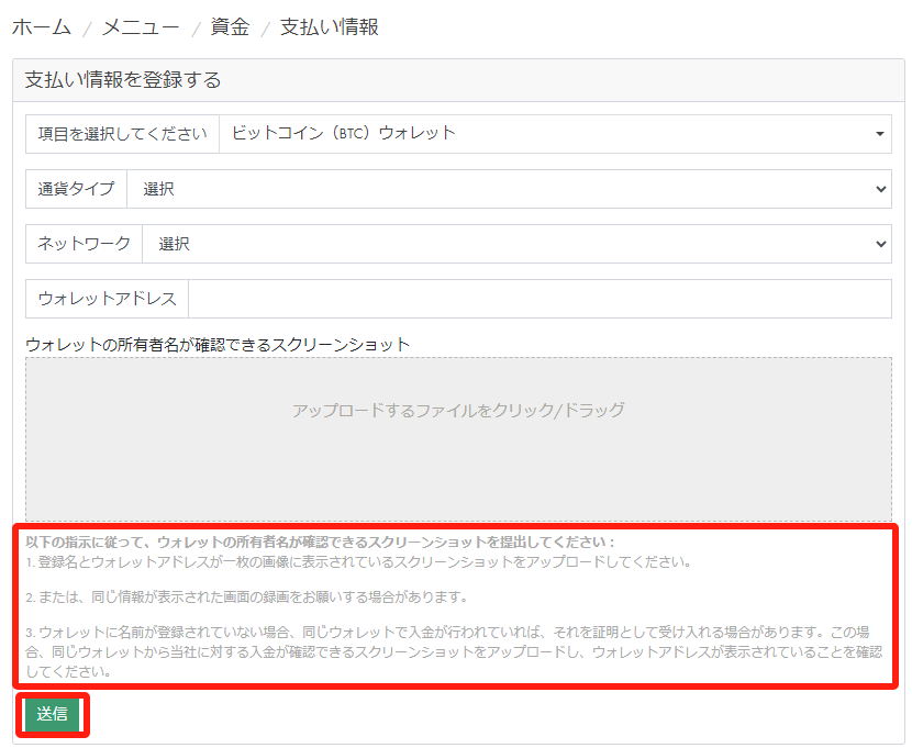 通貨ライプ、ネットワーク、ウォレットアドレスを⼊⼒し、ウォレットの所有者名をアップロードし、「送信」をクリックします。