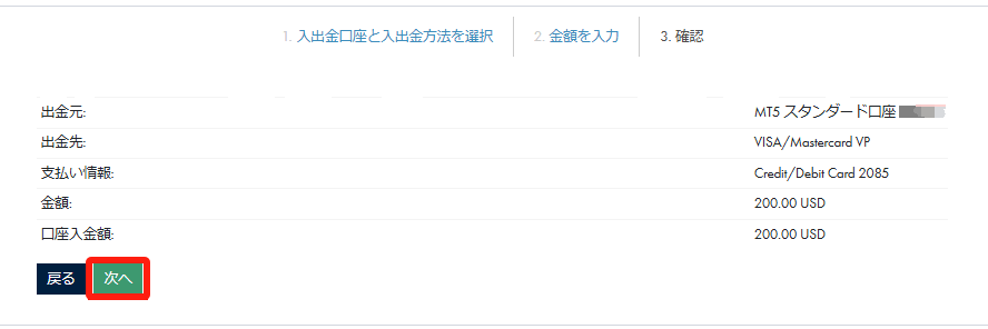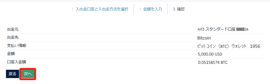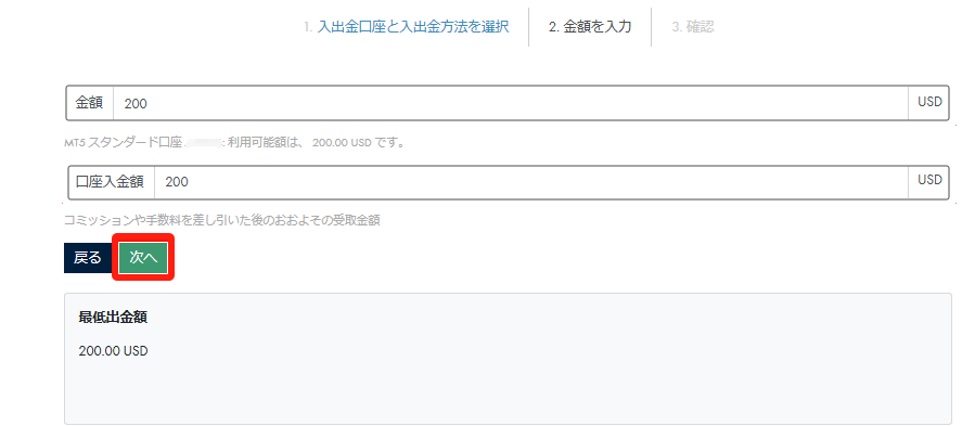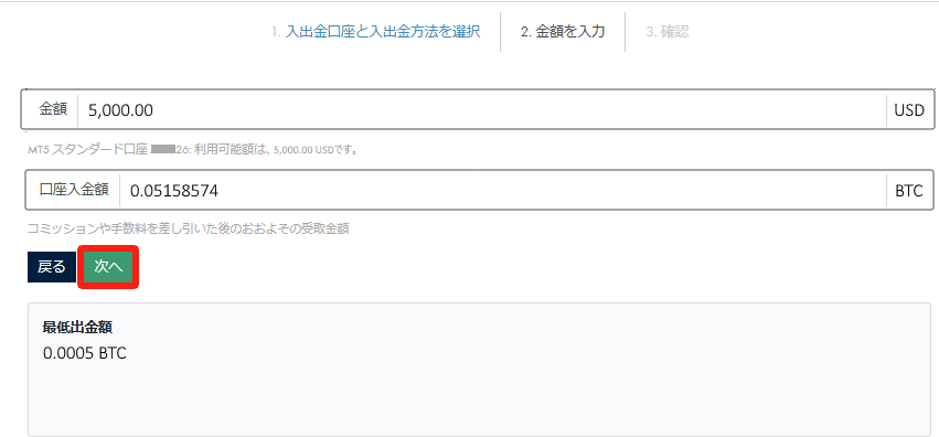 「出⾦額」をドルで⼊⼒し、「次へ」をクリックします。