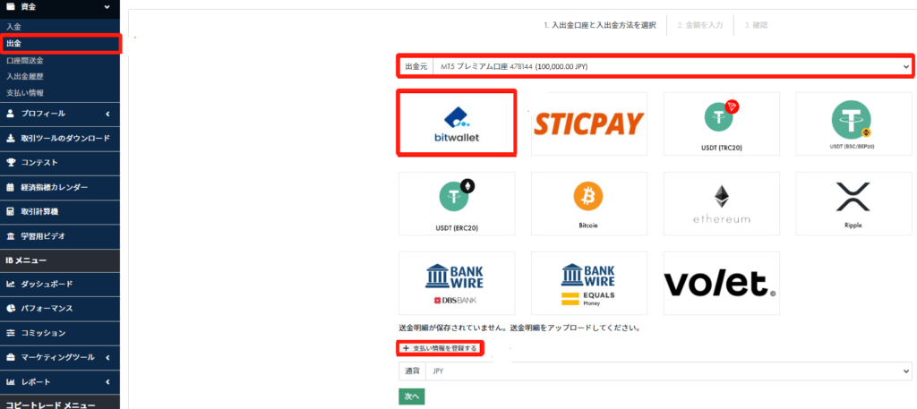 次に、「出⾦先」の⼝座を選択し、出⾦⽅法⼀覧から「bitwallet」を選びます。