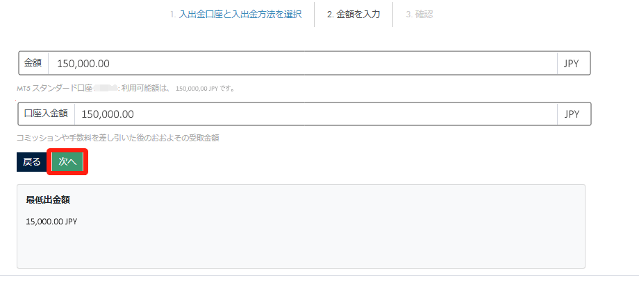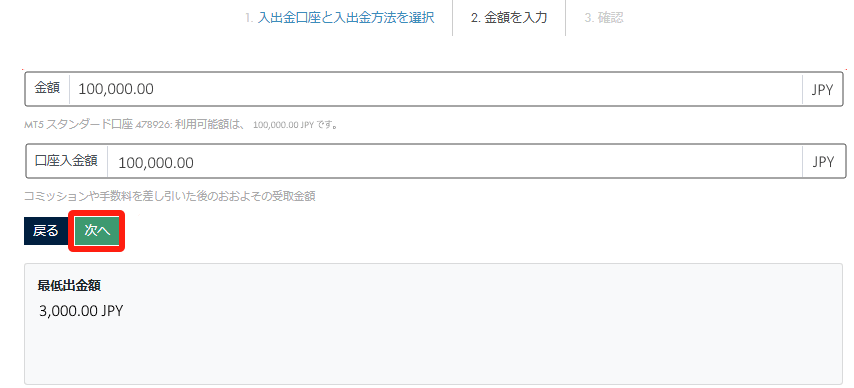 「出⾦額」を円で⼊⼒し、「次へ」をクリックします。