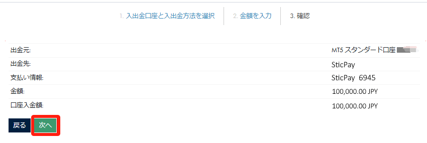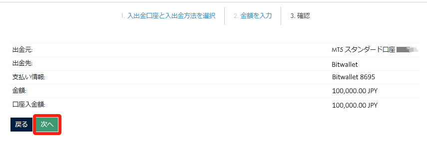 出⾦元、出⾦先、⽀払い情報などの出⾦情報を確認し、「次へ」をクリックします。