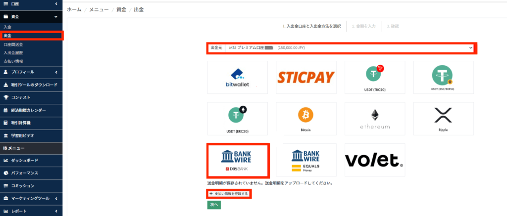 次に、「出⾦先」の⼝座を選択し、出⾦⽅法⼀覧から「銀⾏振込(Bank Wire)」を選びます。
