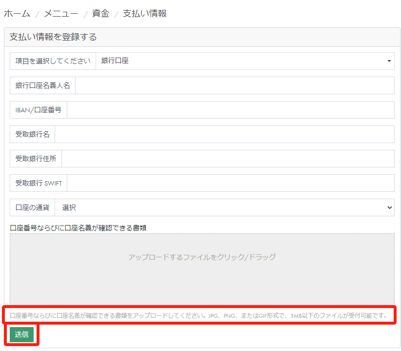 ⼝座番号、銀⾏情報などを⼊⼒し、⼝座番号ならびに⼝座名義が確認できる書類をアップロードし、「送信」をクリックします。