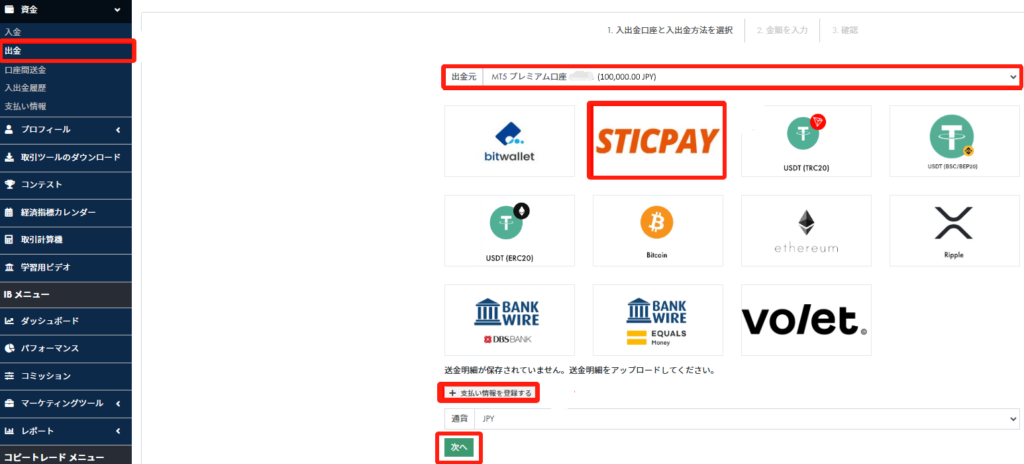 次に、「出⾦先」の⼝座を選択し、出⾦⽅法⼀覧から「STICPAY」を選びます。