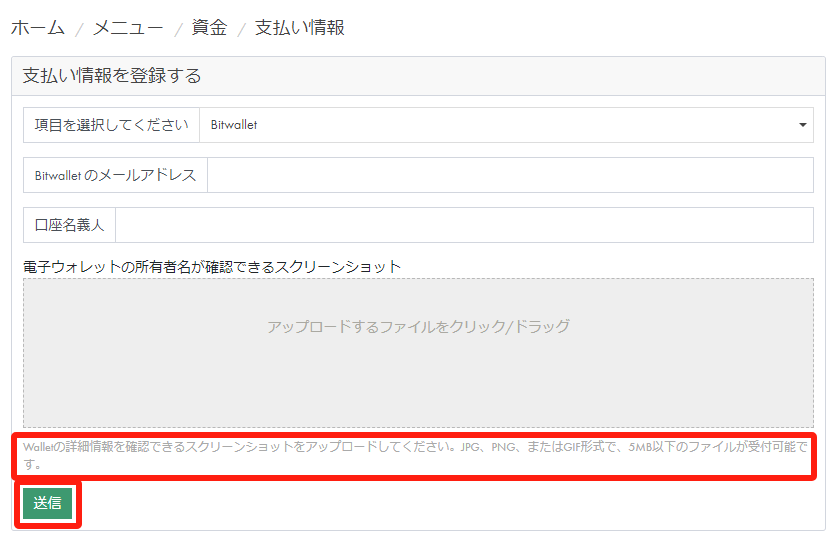 bitwalletのメールアドレス、⼝座名義⼈を⼊⼒し、電⼦ウォレットの所有者名をアップロードし、「送信」をクリックします。