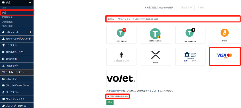 Errante(エランテ)では、「銀⾏振込」「デビットカード/クレジットカード」「STICPAY」「bitwallet」「仮想通貨」の5種類の出⾦⽅法をご利⽤いただけます。