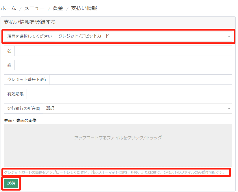 名前、クレジットカードの明細などを⼊⼒し、クレジットカードの画像をアップロードし、「送信」をクリックします。