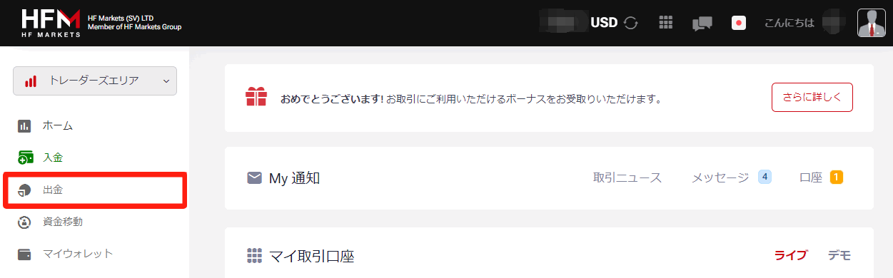 HFMで出⾦する際には、まず取引⼝座の資⾦を⼀旦myWallet(財布⼝座)に移す必要があります。