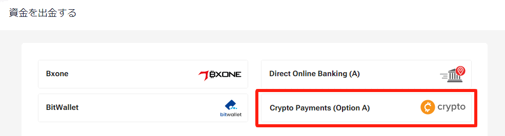 表⽰された出⾦⽅法⼀覧から「仮想通貨」をお選びください。