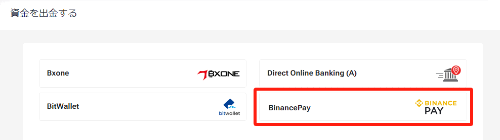 主な出⾦⼿段には、国内銀⾏送⾦、クレジットカード、電⼦ウォレット(bitwallet、BXONE)、そして仮想通貨対応のBinance Payなどがあります。