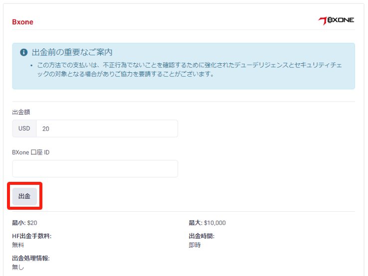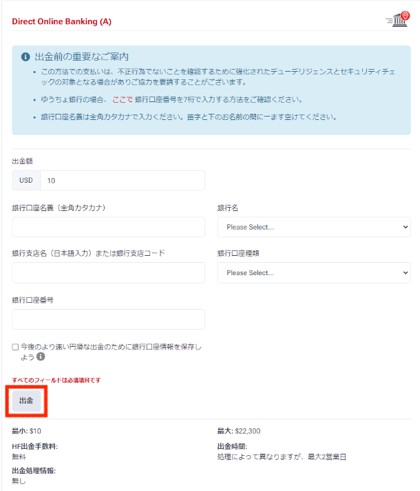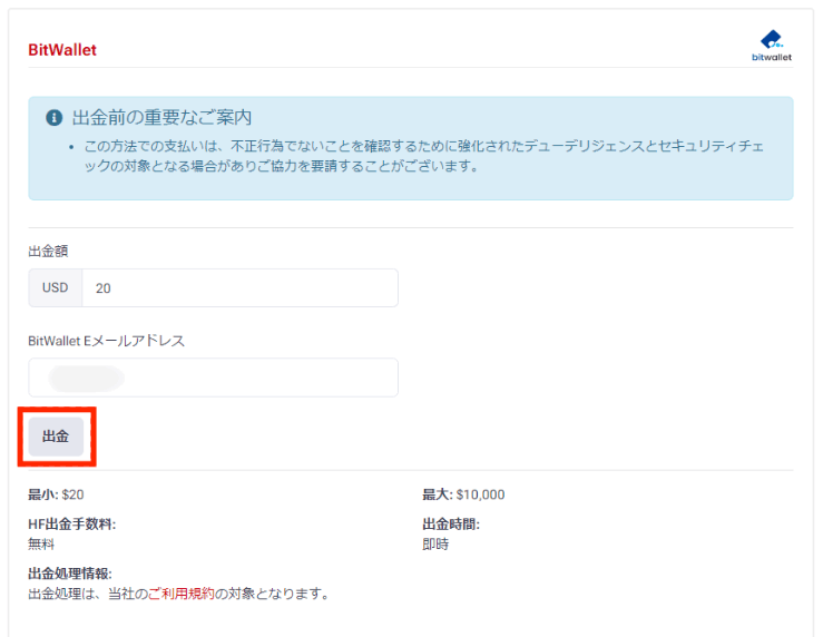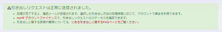 「出⾦」ボタンを押すと、HFMに出⾦リクエストが送信されますので、内容を⼗分に確認してから押してください。