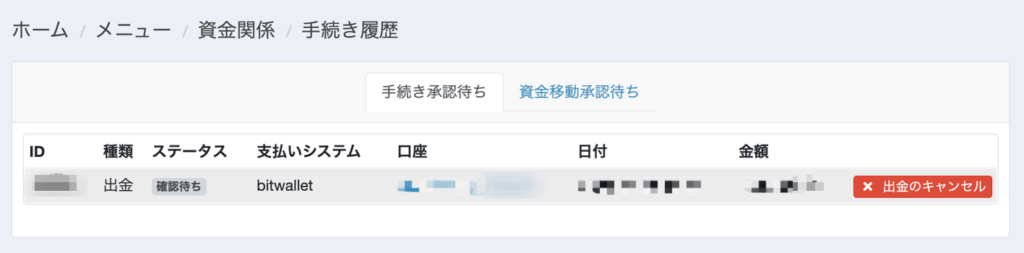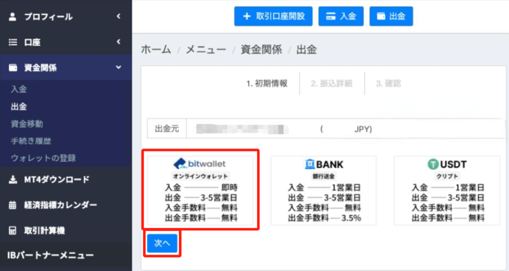 マイページのメニューから「出⾦」を選び、出⾦⽅法の⼀覧から「bitwallet」を選択してください。