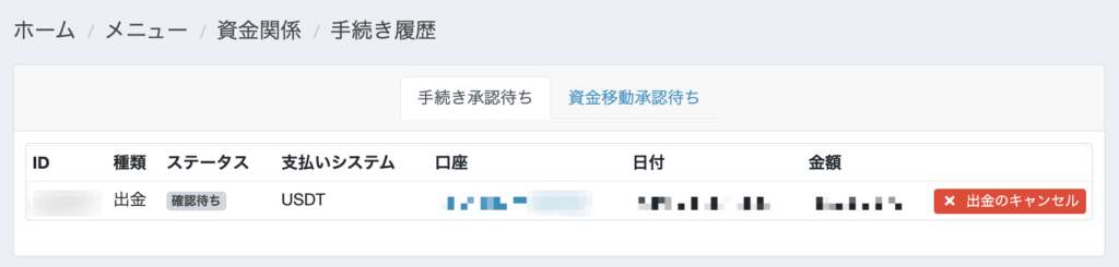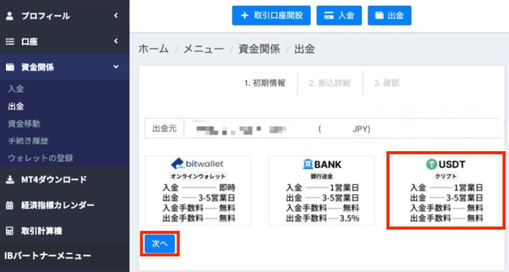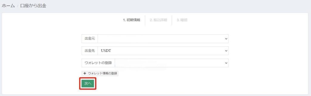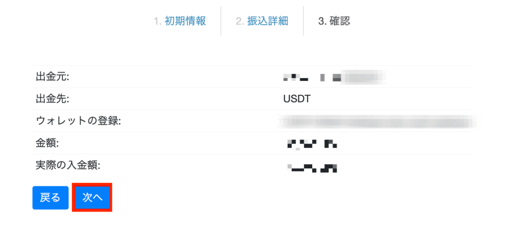 案内に従って、「出⾦元」から⼝座を選択し、「出⾦先」にはUSDTをを指定します。