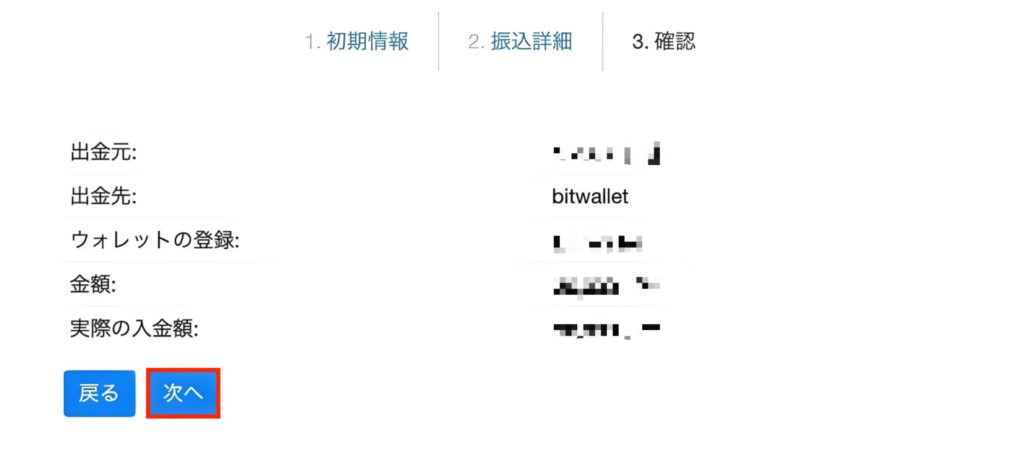 案内に従って、「出⾦元」から⼝座を選択し、「出⾦先」にはbitwalletを指定します。