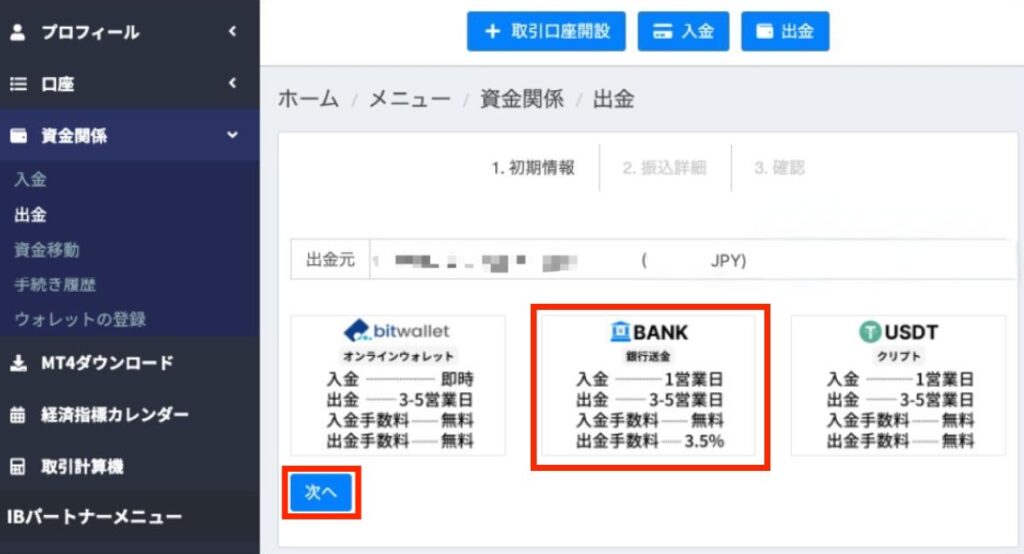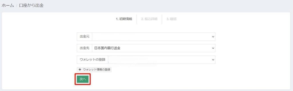 「ウォレットの登録」では、銀⾏送⾦の銀⾏⼝座を選択し、「次へ」を押してください。
