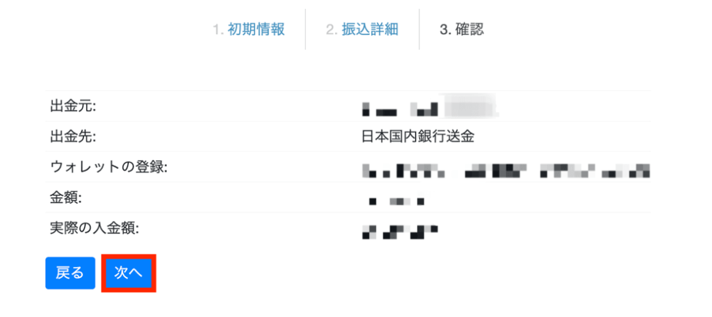 出⾦内容を確認し、「次へ」をクリックしてください。