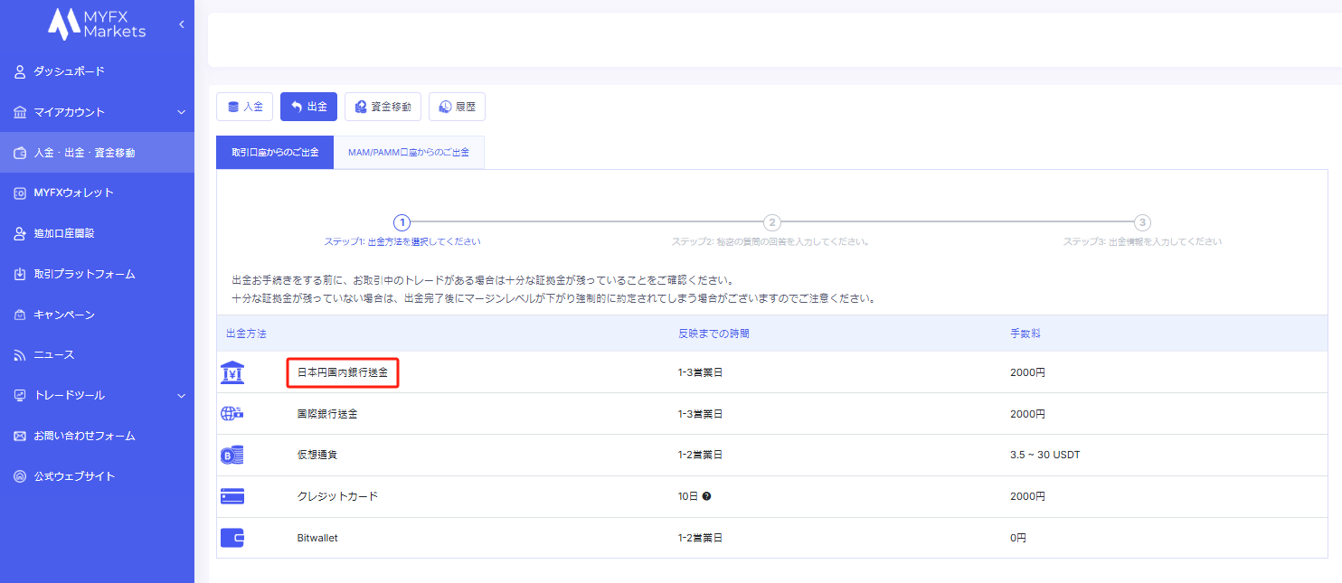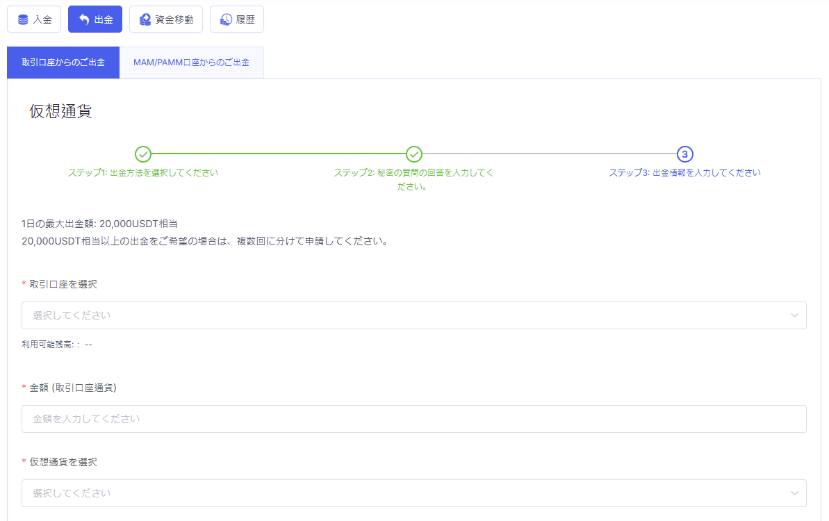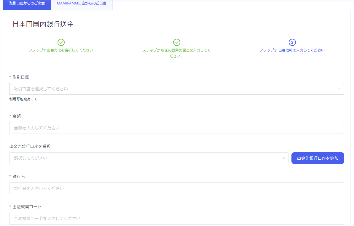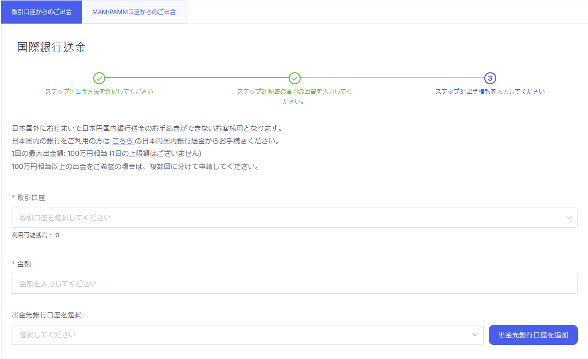 ※取引口座の通貨と銀行口座の通貨が異なる場合、出金申請の際に、コメント欄に銀行口座の通貨を記入する必要があります。
