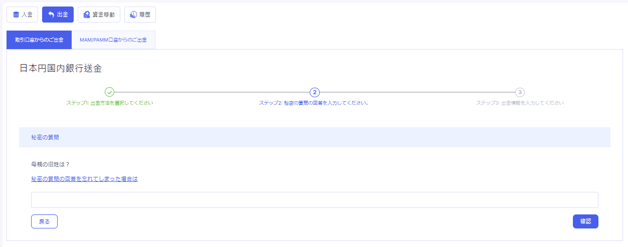 次の画面で、出金先の銀行情報を入力する必要があります。 すべての情報を確認後、「送信」ボタンをクリックすることで、国内銀行送金による出金申請が完了します。