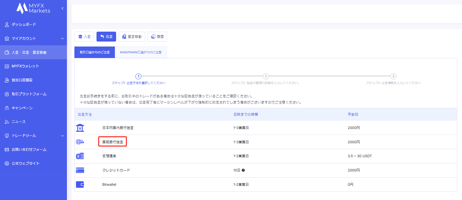 MYFXMarkets(マイエフエックス)では、現在5種類の出金方法をご利用いただけます。それぞれ手数料や着金までの時間が異なるため、詳細を確認のうえ、ご自身に最適な方法をお選びください。スムーズな出金手続きを行うためにも、各オプションの特徴を事前にご確認ください。