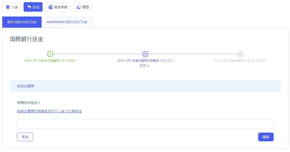 次の画面で、出金先の銀行情報を入力する必要があります。 すべての情報を確認後、「送信」ボタンをクリックすることで、国際銀行送金による出金申請が完了します。