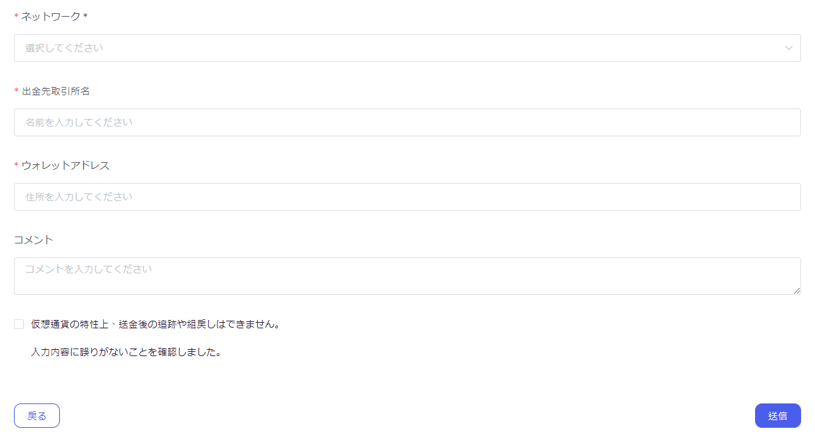 次の画面で、出金先のウォレット情報を入力する必要があります。 すべての情報を確認後、「送信」ボタンをクリックすることで、仮想通貨による出金申請が完了します。
