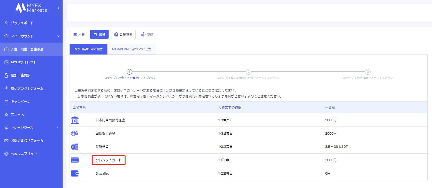 ログイン後、左側のメニューから「入金・出金・資金移動」を選択してください。 その後、出金方法の一覧から「クレジットカード」を選択してください。