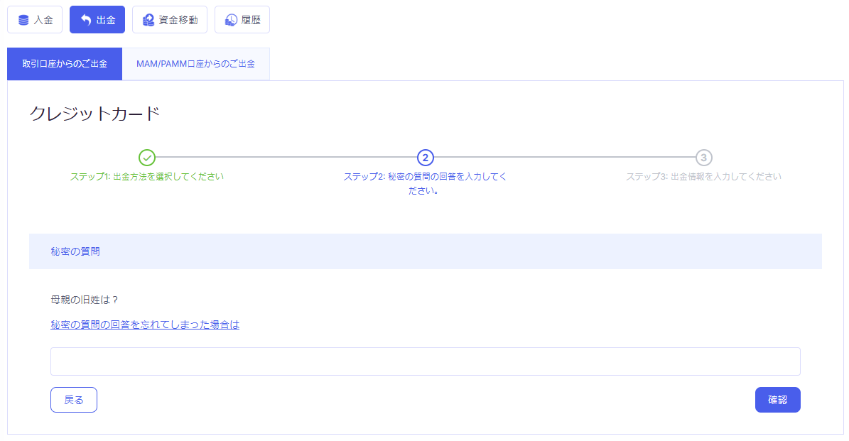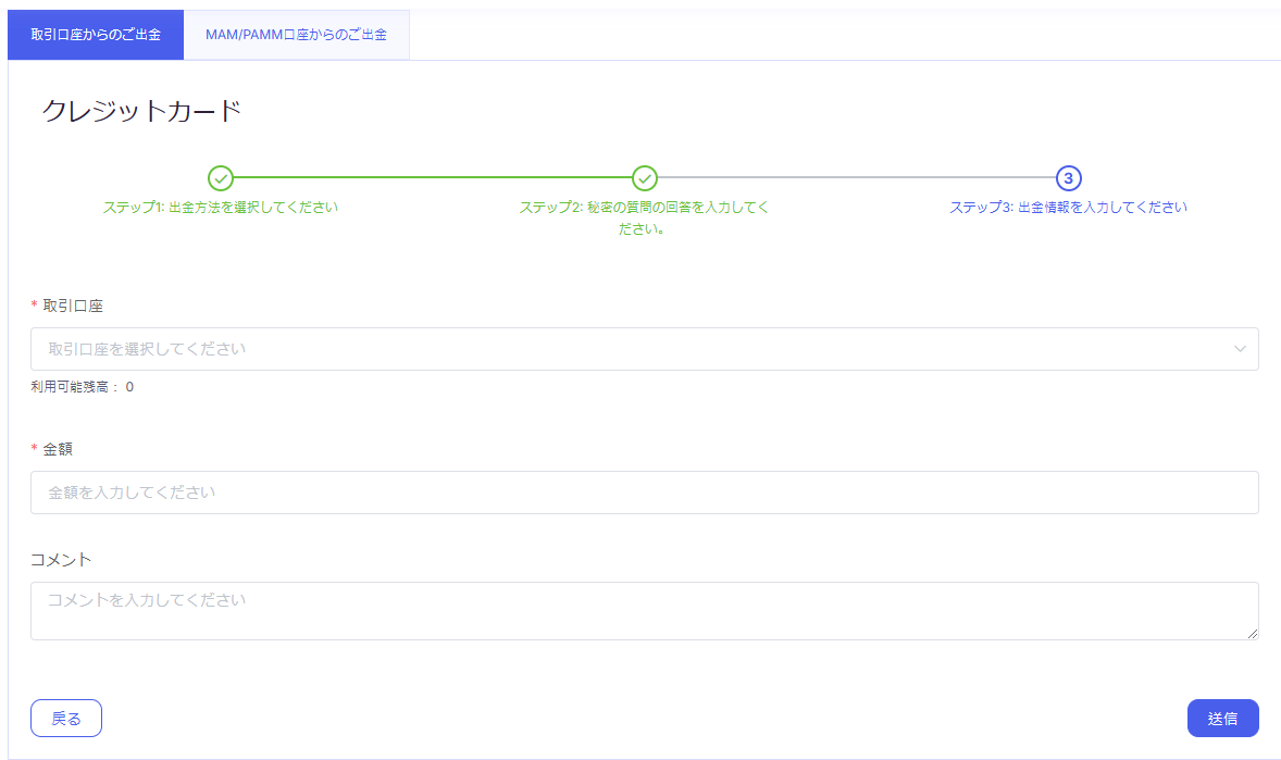 次の画面で、「取引口座」を選択し「金額」を入力します。 すべての情報を確認後、「送信」ボタンをクリックすることで、クレジットカードによる出金申請が完了します。
