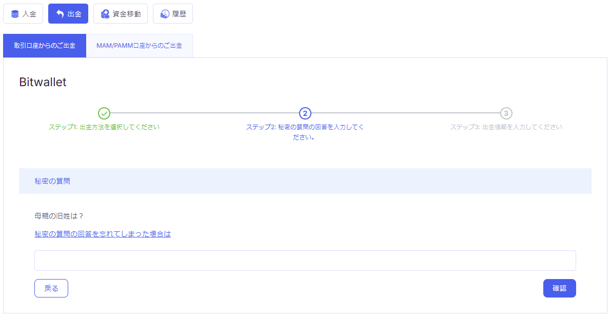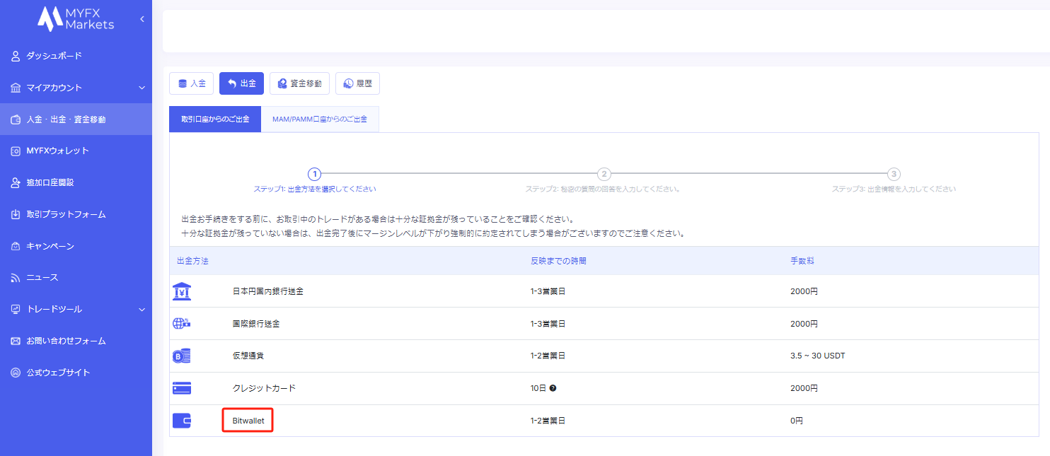 ログイン後、左側のメニューから「入金・出金・資金移動」を選択してください。 その後、出金方法の一覧から「Bitwallet」を選択してください。