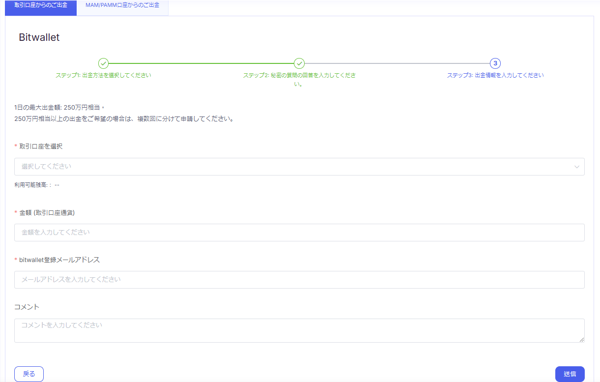 次の画面で、「取引口座」を選択し「金額」と「bitwallet登録メールアドレス」を入力します。 すべての情報を確認後、「送信」ボタンをクリックすることで、bitwalletによる出金申請が完了します。